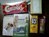 中身は、メインのプリント写真、それを焼いたDVD。レーベルはもちろんオリジナル(タイトル『ピースちゃんとお友達』だって(≧▽≦)カワイイ!)。そして福袋というのは、ストロベリーのクランキーチョコ、キティのキャンディ、バナナチョコ、ハニーティー、飾りつきピン止め、ミニSDカード(512MB)、充電池エネループ2本、のこと。カードと充電池はデジカメ新調祝いだって。他はなんだろ?