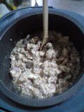 材料はささみとレバーをキヌアと一緒に煮干し一つとスキムミルクで炊いて、すったり切ったりつぶしたりした野菜類(かぼちゃ、人参、きゅうり、いんげん、トマト)を加えた。素材で言えば、およそ肉類70%その他30%の簡単な割合。一応必要タンパク質量はとれてる計算だけど、フードと混ぜちゃうから全体的にはどうなんだか。