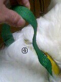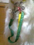 でも、いつも短いリードをしてる私にわざわざなぜ? と思ったら、「普通にリードをつけて(写真①)、持ち手をこうしてカラビナで止めて(写真②)、かぶせて(写真③)、ほらこれなら引っかからないし、ここがとっさのリードになる(写真④)でしょ」