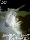 そ、今回は妹も同行。しかし目的はピースに朝起こされたいだけというので、チェックイン以降部屋ごもり(なんと、朝9時過ぎにチェックインできる!)。ほぼ貫徹だったし爆睡こいてた気。ドライバーは釣りだし、昼には妹とほうとう食いに行きやがった。つまりオフ会には私のみの参加だったわけだ。というわけで、お昼は私はピースとともにグッチパパの車で皆さんとドッグカフェ。やっぱりピースは落ち着きがなかった。はぁ〜。
