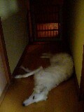 写真は、それ以上先に行けないペットゲートの前、ひんやりした廊下でふて寝するピース。