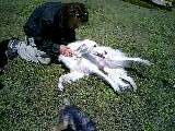 写真は、ビーグルのベルちゃんのパパに甘えて可愛がられてるピース。手前のお尻がちょっと見えてるのは、ヨーキーのミック。